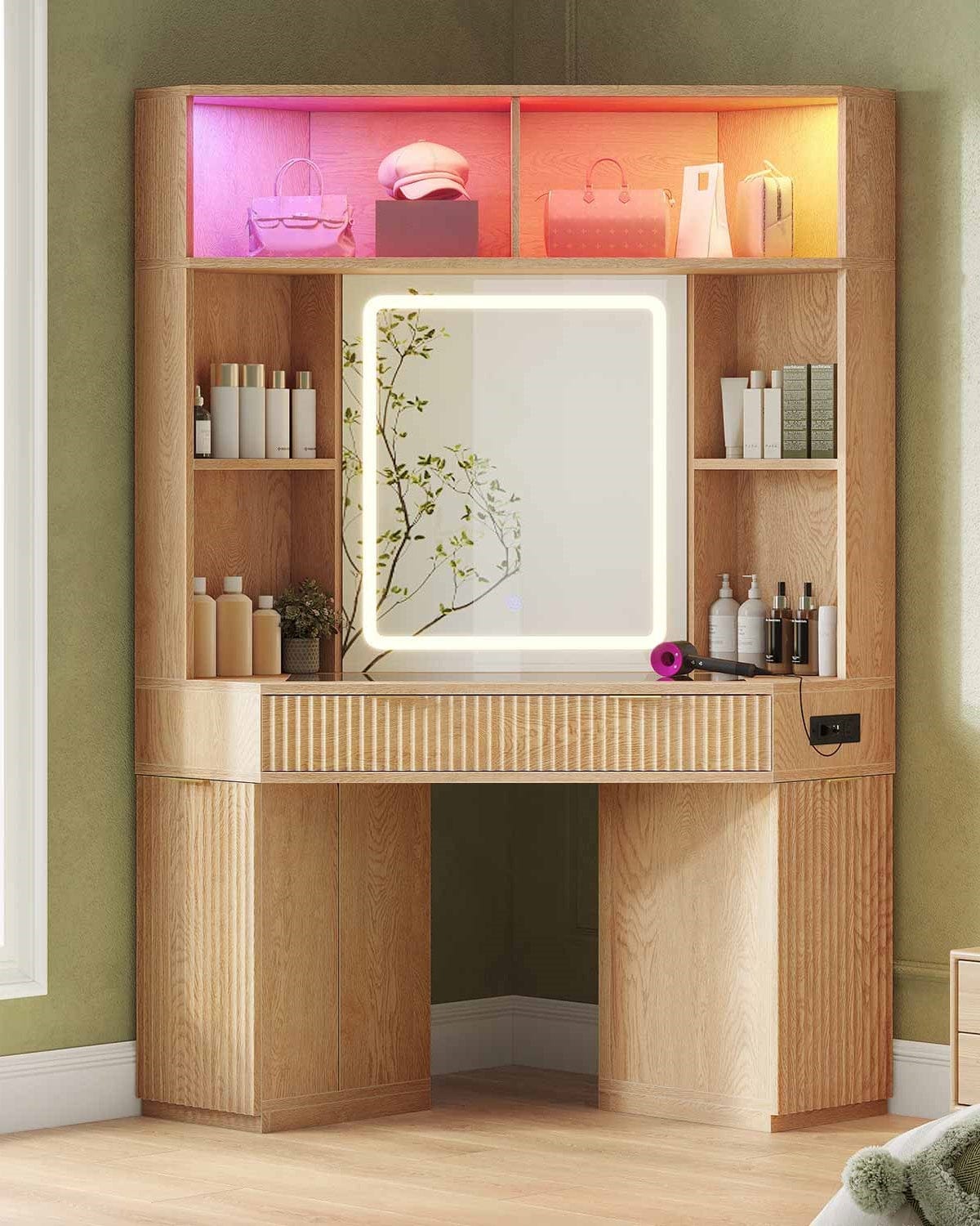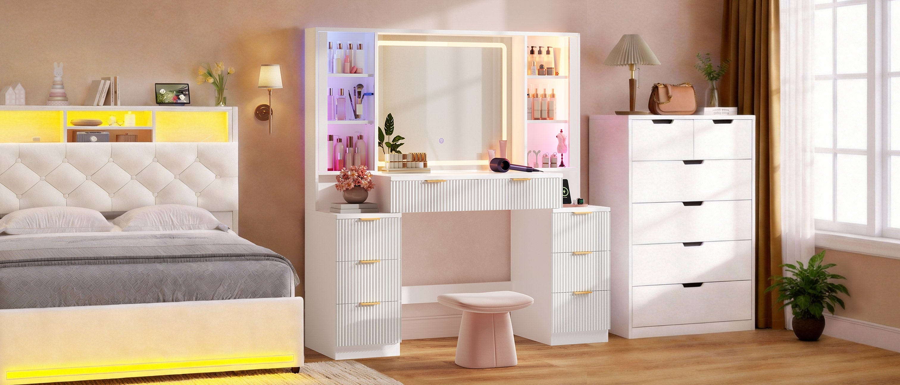 Discover Hauoms' Fluted Vanity Desk - the ultimate space-saving solution with 50% more storage, music-sync...