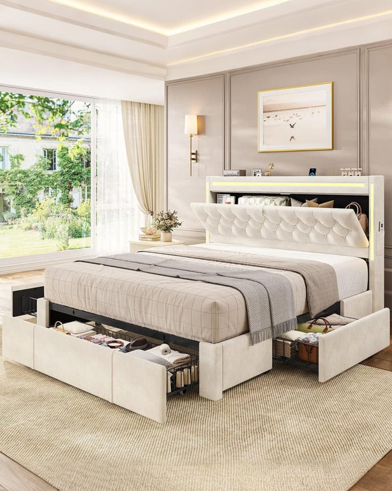 HAUOMS LED Full Bed Frame combines smart LED lighting, practical storage headboard with charging station,...
